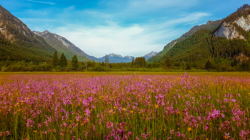 Alpine Wildflusslandschaft, artenreiche Wiesen, Bergwald, Hoch- und Niedermoore, Felsige Dolomit-Gebirgskämme